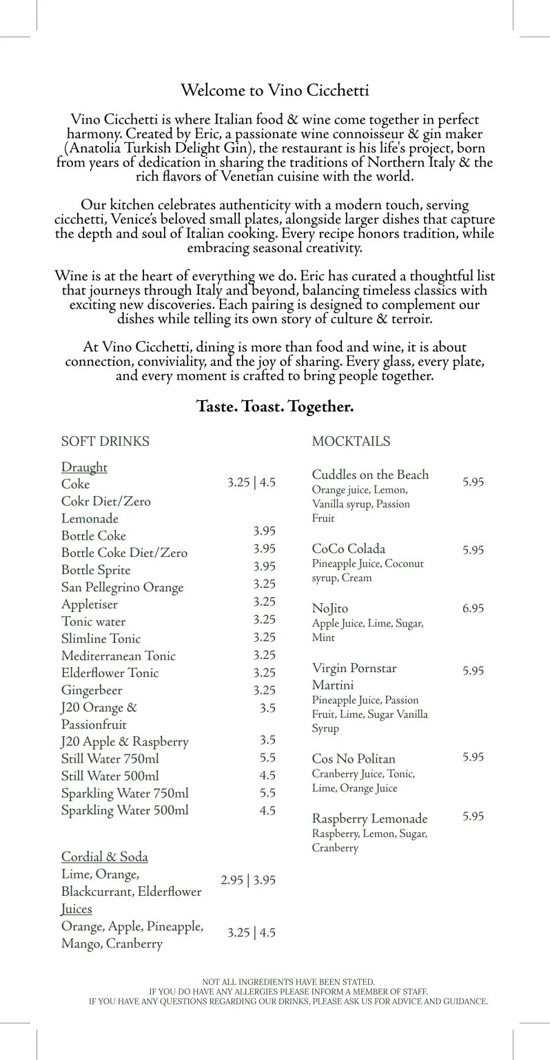 Vino Cicchetti was born from a love of wine, food, and the art of bringing people together. Our name blends “vino”, the carefully sourced wines from across Italy and the Mediterranean, with “cicchetti”, the traditional Venetian large plates designed to be shared.